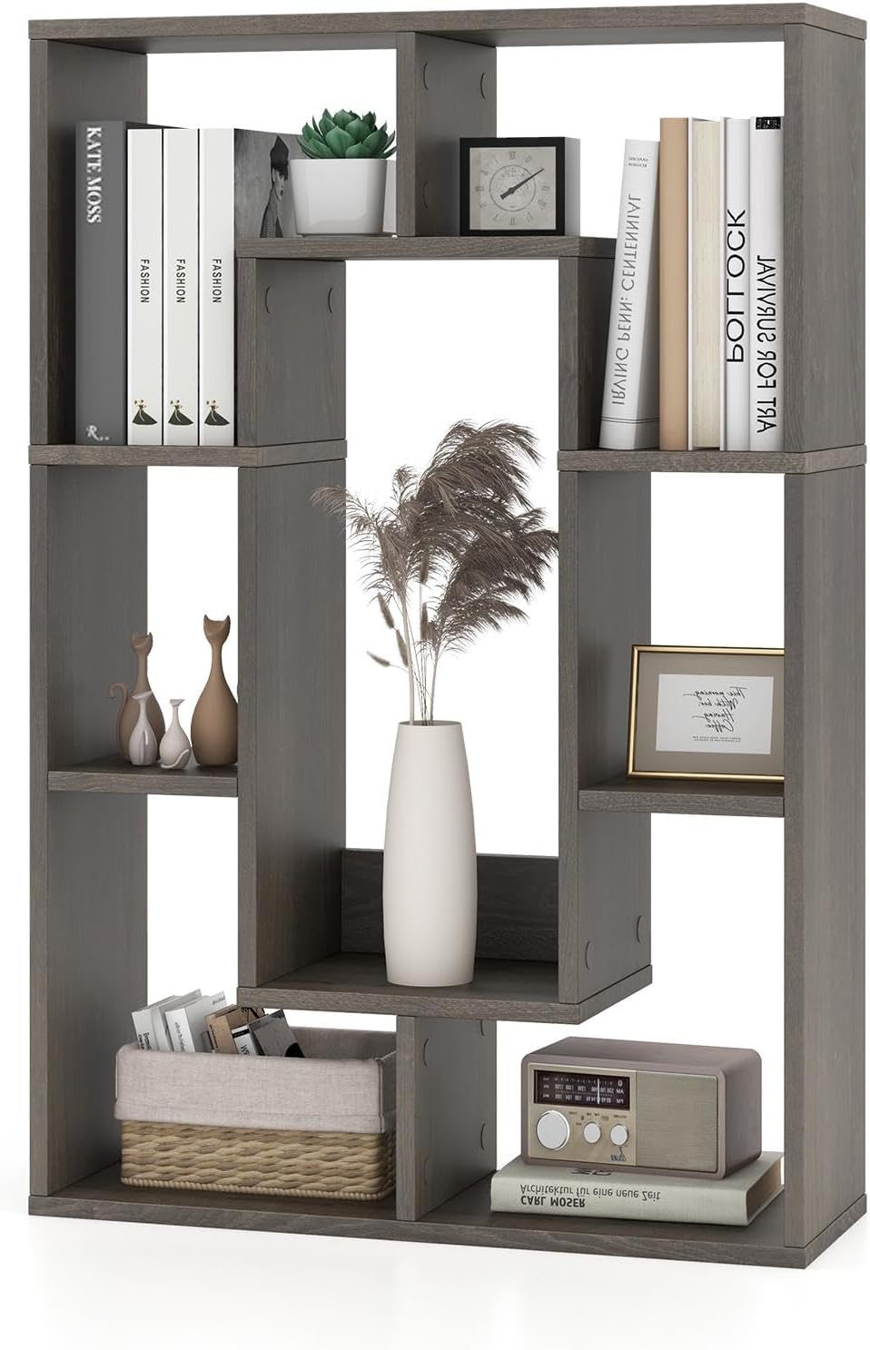 Description: Introducing our captivating geometric bookshelf, a visually stunning addition that combines practicality and aesthetics. Featuring 7 cubes for effortless organization, this bookcase transforms any room into a stylishly tidy oasis. Also, safety is a top priority, with 2 anti-toppling devices included for added peace of mind. This versatile rack shines as a display shelf, room divider, or standout decor in both home and office settings. With easy assembly and sleek design, this bookshelf is a must-have for those seeking to enhance their space with a touch of elegance. Features: Unique geometric design for aesthetic appeal Ample storage with 7 open compartments 2 anti-toppling devices for added safety Non-slip foot pads prevent floor scratches Easy to clean surface is smooth and water-proof Efficient vertical structure for optimal space usage Multi-functional for living room, bedroom, study, or office Specifications: Color: Gray/Natural/White Material: Engineered Wood Product Dimension: 24” x 8” x 35.5” (L x W x H) Dimension of Top L-shaped Shelf: 11” x 8” x 12” (L x W x H) Dimension of Middle Small Shelf: 6” x 8” x 8.5” (L x W x H) Dimension of Middle Shelf: 9.5” x 7” x 21.5” (L x W x H) Dimension of Bottom L-shaped Shelf: 11” x 8” x 12.5” (L x W x H) Net Weight: 26 lbs Weight Capacity of Top: 100 lbs Weight Capacity of L-shaped Shelf: 33 lbs Weight Capacity of Each Middle Shelf: 22 lbs Package Includes: 1 x Bookshelf 1 x Instruction