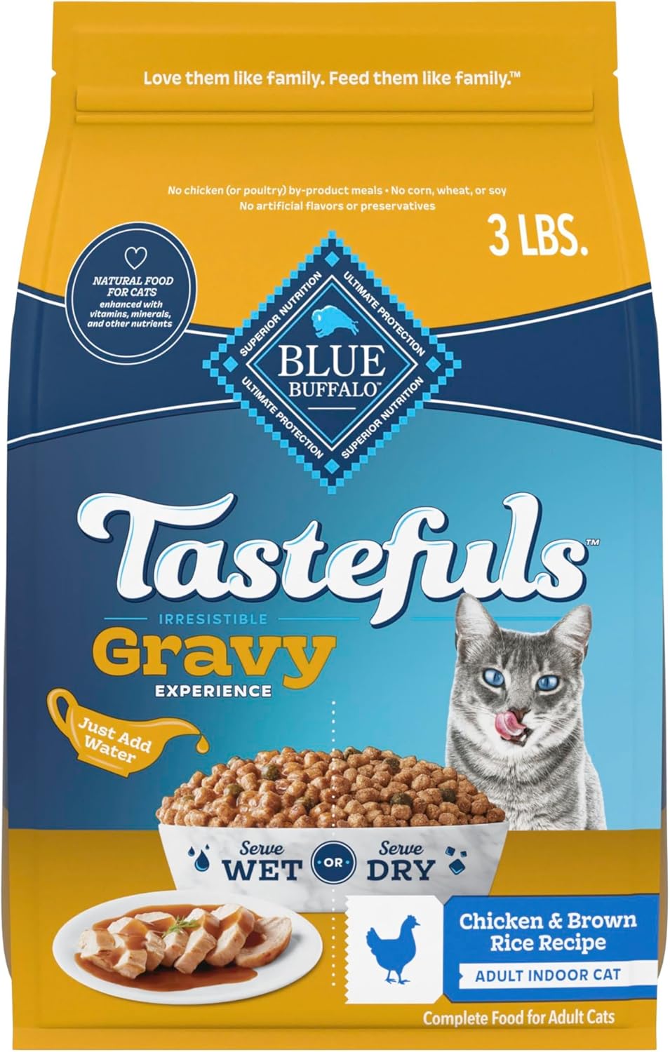 Blue Buffalo Tastefuls Irresistible Gravy Experience Adult Indoor Dry Cat Food lets you transform your cat’s mealtime with the amazing taste of real gravy. Just add warm water to create a savory gravy that keeps cats coming back for more. Tastefuls Irresistible Gravy Experience stays crunchy when wet for up to one hour — and because each bite is coated in gravy goodness, it’s equally delectable when served dry, right from the bag. This deliciously healthy recipe starts with real chicken for mouthwatering flavor to satisfy even the most particular palate. Made from natural ingredients you’ll both love, enhanced with vitamins, minerals, and other nutrients, Tastefuls Irresistible Gravy Experience recipes deliver the taste that cats crave and the quality Pet Parents demand. BLUE Tastefuls Irresistible Gravy Experience recipes provide balanced nutrition for adult cats with high-quality protein, healthy complex carbohydrates, and nutritious fruits and vegetables. Plus, BLUE Tastefuls contains our exclusive LifeSource Bits, a precise blend of antioxidants, vitamins, and minerals to support immune system health and a healthy oxidative balance for your cat. BLUE Tastefuls is backed by the True BLUE Promise and always starts with real meat, poultry, or fish. It contains no chicken or poultry by-product meals, no corn, wheat, or soy, and no artificial flavors or preservatives. Love them like family. Feed them like family.