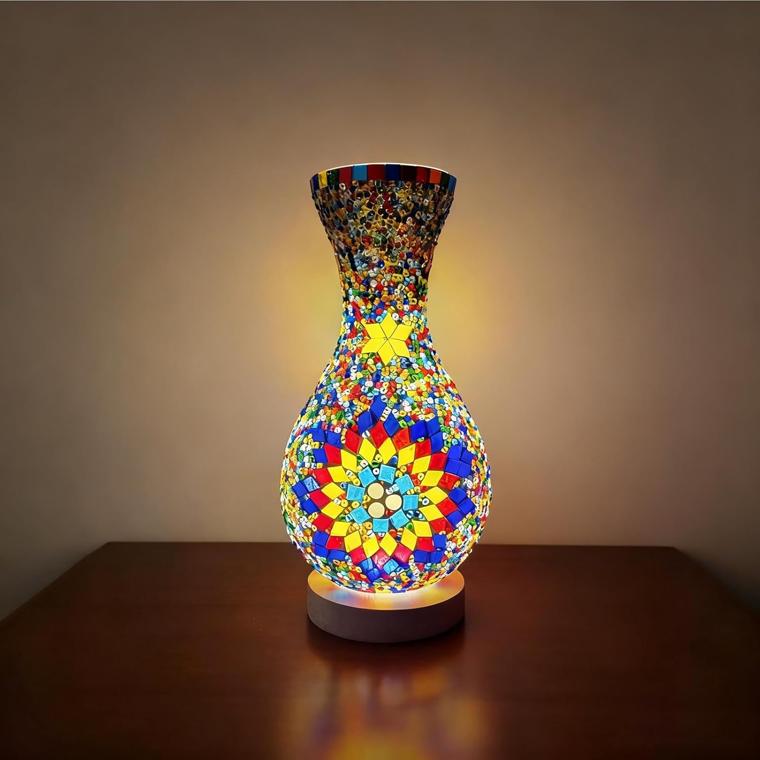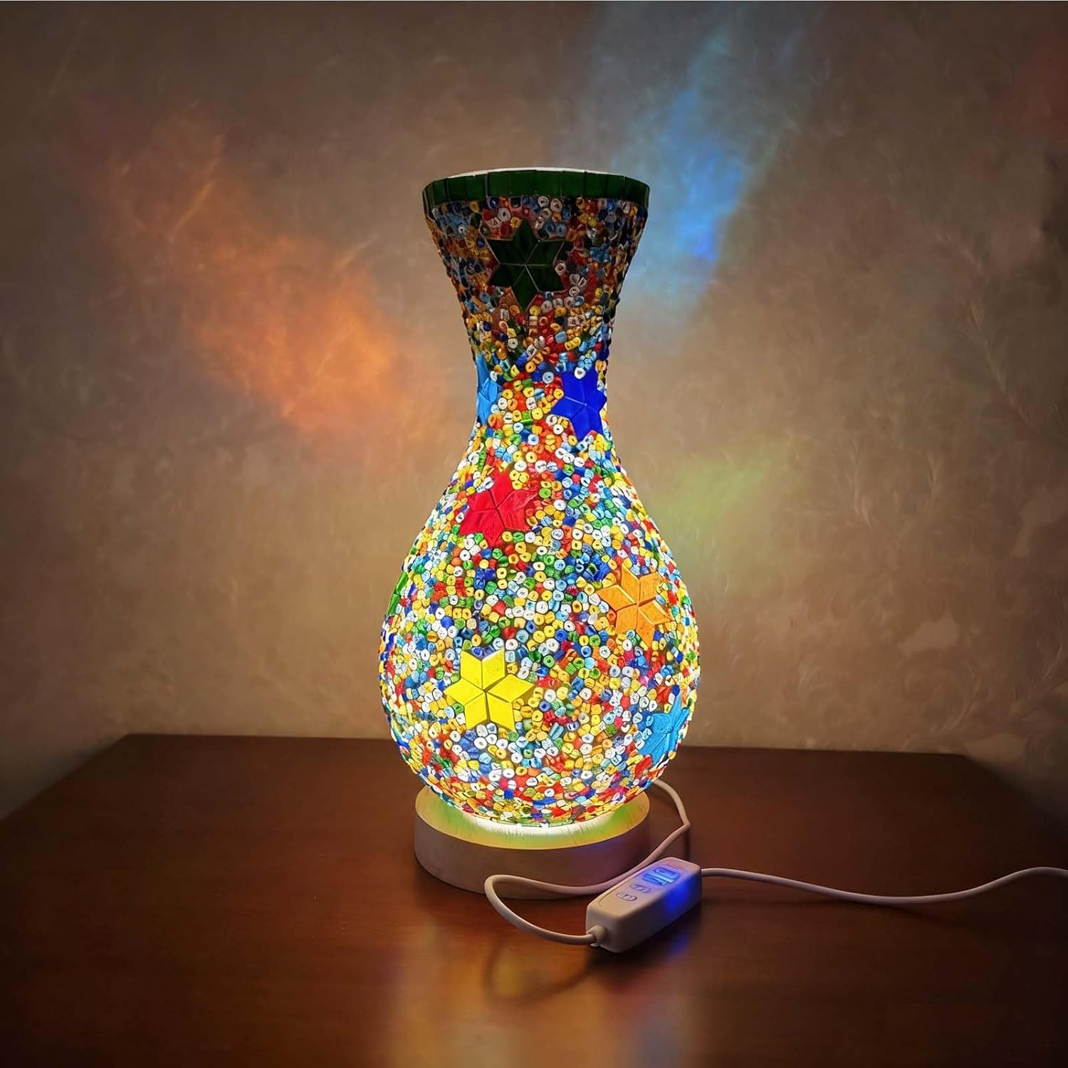 Effortless Operation: Designed for seamless integration into your modern life, this plug-in lamp features a convenient button switch located at its base. A simple press bathes your space in its enchanting glow; another press returns it to serene darkness. There are no complicated dimmers or fussy touch controls—just pure, reliable functionality. Simply plug it into any standard outlet, and let the transformation begin. Personal Sanctuary & Bedroom Serenity:Place it on your bedside table. Its gentle, warm light is the perfect antidote to the harsh blue glow of smartphones and tablets, creating a calming pre-sleep ritual. Living Room & Dining Room Ambiance:Transform your living room into a cozy, conversational lounge or turn a simple dinner into an intimate, romantic feast. Meditation & Yoga Haven:For those who practice mindfulness, yoga, or meditation, this lamp is an essential tool. Home Office & Creative Studio Focus:In your home office, it acts as a superb task light that reduces eye strain without the coldness of LED desk lamps. PACKAGE INCLUDE: Morocco vase night light x1 38in USB power cord plug x1 Technical Specifications: Size: 5.11in*11in(13cm*28cm) Material: LED+glass+wooden base Install:can put on the table shelf ATTENTION:Designed mainly for decorative purpose,Cannot be taken as a substitute of daily lighting.But it can be used as a night light!Store the light in a cool and dry place if product is not to be used for a long time.